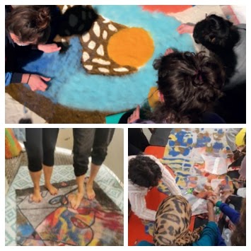 Dans le cadre du projet RECITAM (financé par la MSH Mondes et la Ligue contre le Cancer de Seine-Saint-Denis), un atelier a réuni pendant 3 jours (14, 15, 16 septembre), des femmes atteintes ou ayant eu un cancer du sein, des chercheurs et un collectif d’artistes « Les Marchandes de Tapis » autour de la réalisation d’une œuvre collective. A travers la création d’un tapis en laine feutrée de grande dimension, l’objectif est d’ouvrir de nouveaux espaces de réflexion sur la représentation des parcours de soins dans le champ de l’oncologie, de mettre en avant les émotions et relations aux lieux et d’associer cartographie sensible et pratique artistique.
